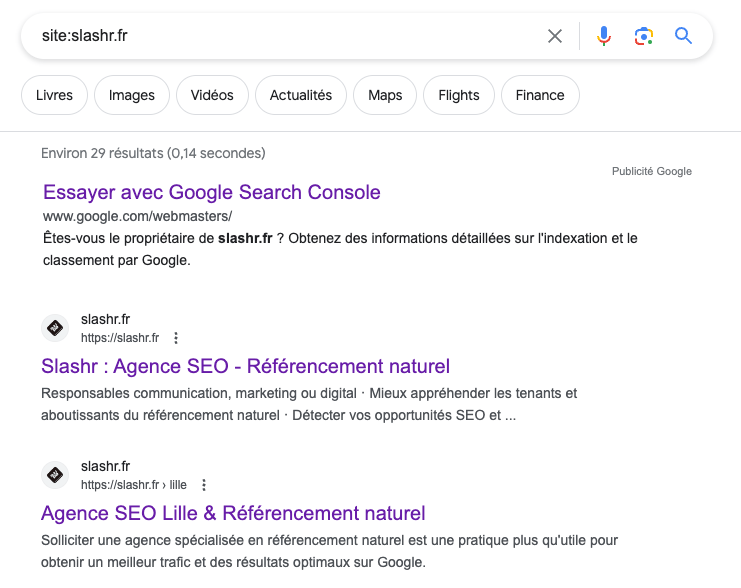 Cette solution de recherche est simple et rapide mais malheureusement pas fiable à 100 %. On constate que parfois, certaines URLUniform Resource Locator. Adresse unique d'une page web. Une URL optimisée est courte, descriptive et contient le mot-clé. indexées ne s’affichent pas avec cette méthode.