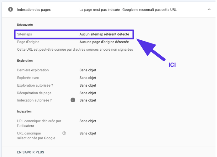 Si votre page n’est pas incluse dans le plan du site ou bien non indexée, le message d’erreur suivant s’affiche : “URL non présente dans Google” et “Plan du site : N/A”