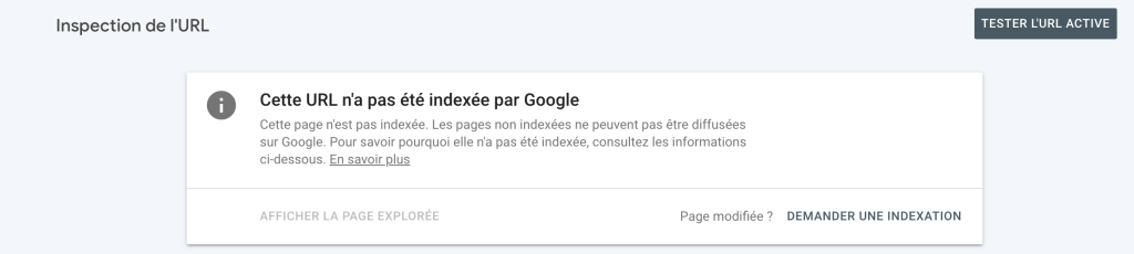 - Seconde possibilité : La Search Console vous informe que l’URL n’a pas été indexée par Google.