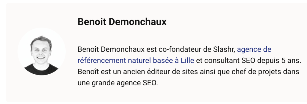 Rédiger une page auteur en s’appliquant à fournir du contenu authentique, qualitatif et intéressant va renforcer l’autorité et la crédibilité du site. Une page auteur doit être représentative de votre niveau d’expérience et de votre compétence.