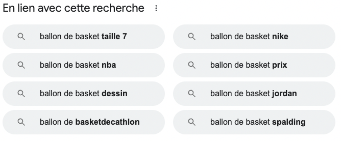 Lorsque nous tapons une requête dans la barre de recherche de Google, les “recherches associées” apparaissent plus bas dans la page de résultatsSearch Engine Results Page. Page affichée par un moteur de recherche en réponse à une requête utilisateur.. C’est une liste de termes proposée, se rapportant à la recherche initiale.