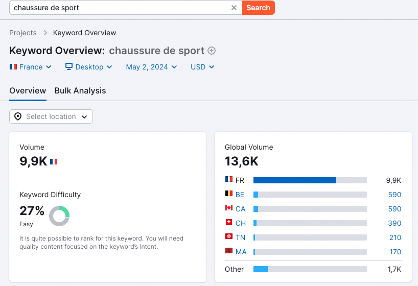 - Les mots-clés de courte traine, génériques : Ce sont les mots-clés les plus recherchés mais aussi les plus concurrentiels. Exemple « chaussure », « basket »